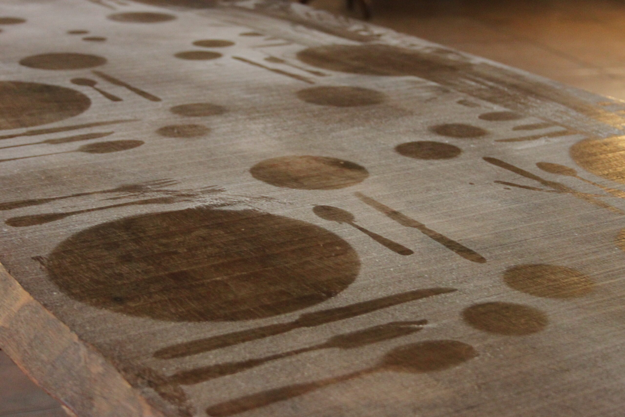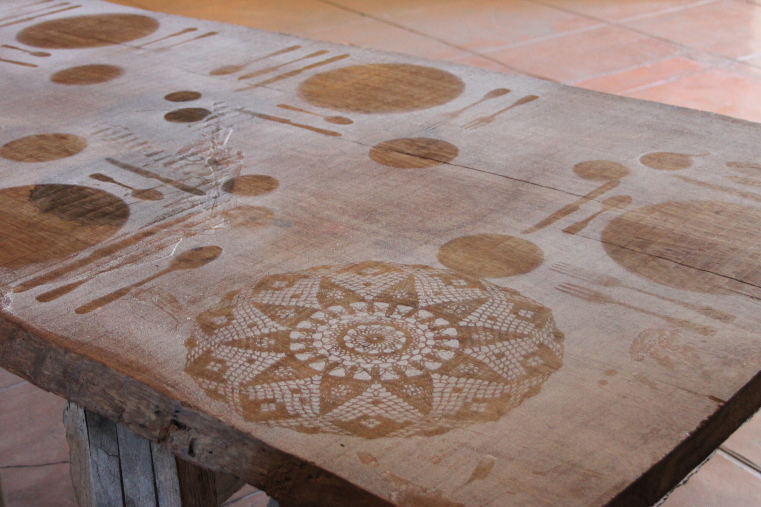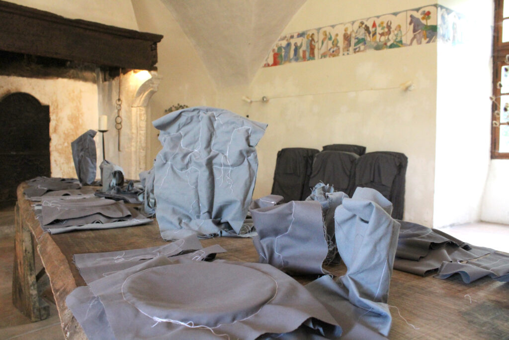 De fait, c’est un « banquet fantôme » qu’elle a donné à voir à Alba, impression accentuée par le fait que l’artiste avait retiré les chaises – pliantes qu’elle avait apportées – en les disposant dans un angle de la pièce, les rendant elles aussi inutilisables par leur enveloppe en tissu. Cacher ces objets dans ces contenants en tissu rappelle également, selon elle, le fait que les personnes atteintes de cette maladie perdent leurs capacités à réaliser des actions tel que manger avec des couverts. En outre, rapporté au cadre du lieu dans lequel se déployait cette installation, c’est aussi, selon moi, le souvenir d’un banquet passé qui a pu se dérouler dans cet édifice qu’il était possible d’interpréter ; les acteurs absents se trouvant implicitement présents dans la fresque qui couvre un pan de cette salle.