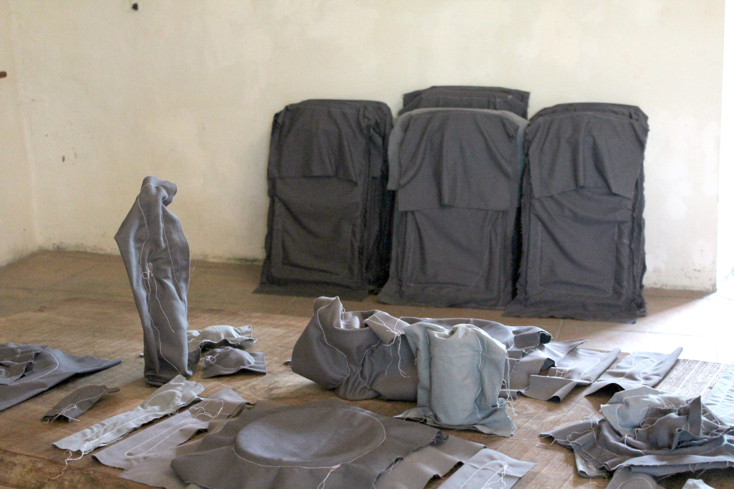 En effet, dans son processus pour entrer en contact avec les personnes souffrant d’Alzheimer, Elfi Exertier avait fait des recherches sur des méthodes de communications notamment par la gestuelle et les cinq sens. Ainsi, l’installation présentée à Alba était inédite mais comportait néanmoins des antécédents, l’artiste ayant réalisé avec ces personnes des « prototypes » d’Objets cachés dont des couverts tels qu’elle en a reproduits pour former le banquet dressé au château. Concernant le développement formel de ces Objets cachés, les objets sont placés dans le tissu, « comme dans une housse » et l’artiste coud par-dessus. Elfi Exertier qualifie sa pratique de l’ordre de « l’empreinte » plus que de celle du « moule », l’idée de patron n’étant pas présente. Par ailleurs, en revenant sur cette installation, elle m’expliquait avoir fait référence aux rencontres de personnes atteintes d’Alzheimer, organisées autour d’une grande table et auxquelles elle avait assistées. Plus spécifiquement, le choix de la couleur grise pour le tissu utilisé renvoyait au « silence », celui de ces personnes ; le gris pouvant également être considéré comme une « non-couleur » se référant à l’absence. La dialectique « présence/absence » est très forte dans son travail.