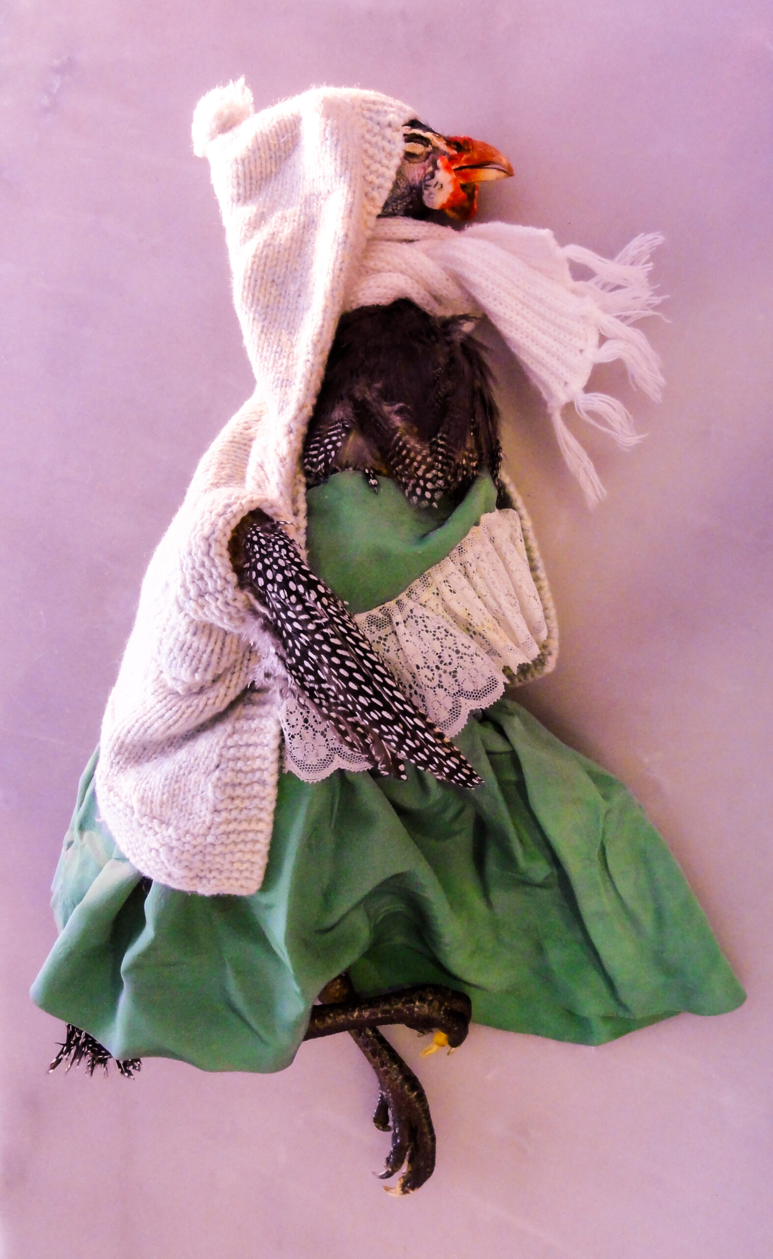 Ce poulet aux yeux fermés se laisse habiller avec délicatesse. Les mains jouent elles habillent cet animal sans vie avec des vêtements de poupées, qui sont à sa taille. Une personnification du poulet se donne à voir, comme une enfant mort-née, Coquette aime se déguiser, on joue avec sa chair.