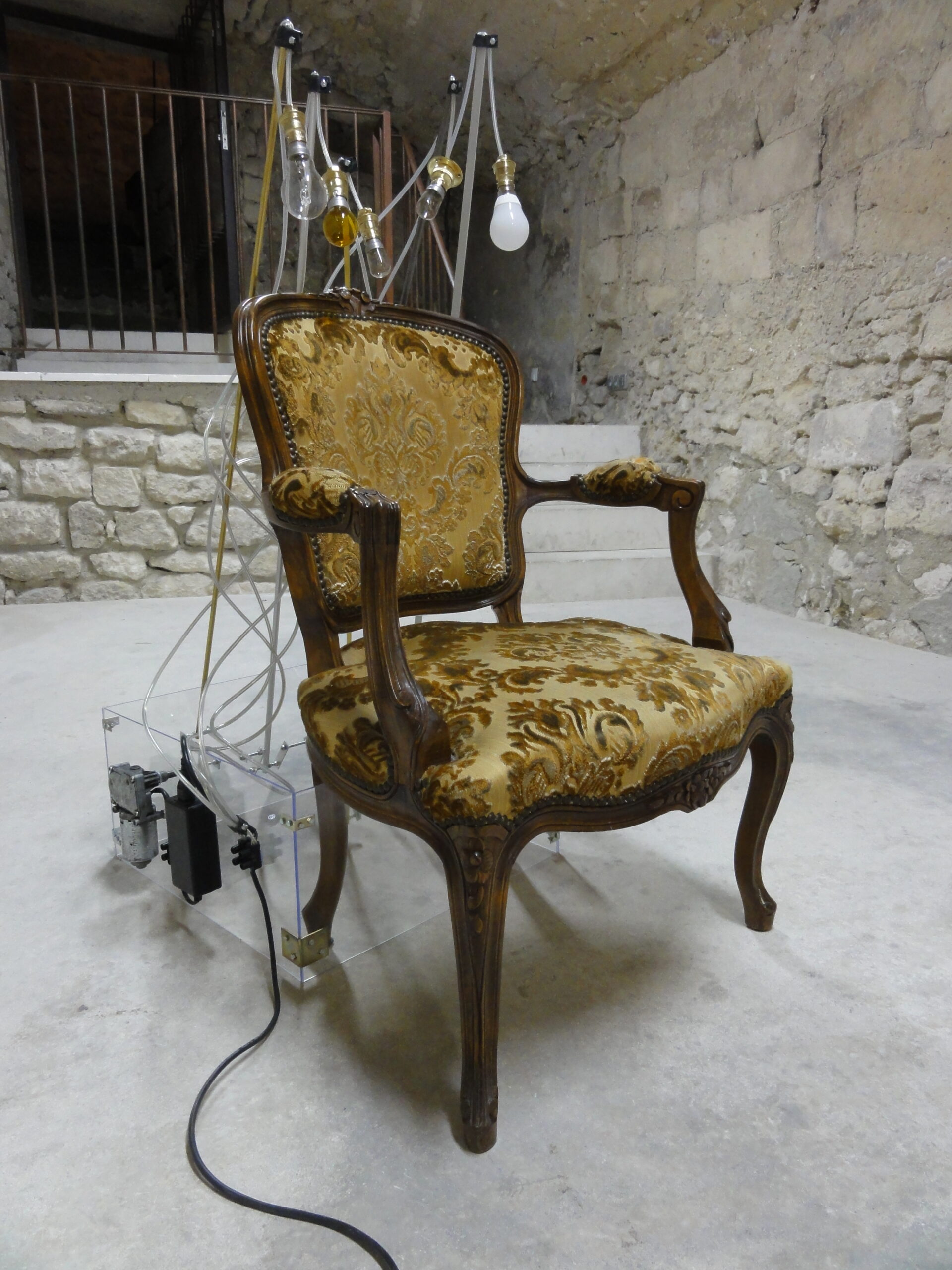 Cette installation est présentée avec le fauteuil que l’on allume et une série de dessins accrochés au mur. Le son du mécanisme donne le rythme, les ampoules symboles des idées s’agitent au dessus du fauteuil, de manière assez inquiétante. Ce qui projette le spectateur dans un jeu d’ombres, l’esthétique du décors de théâtre est apportée par les matériaux utilisés : fauteuil ancien, tiges métalliques disparates, ampoules rondes diverses. Cette machine questionne nos temps de pause ainsi que notre rapport à l’électricité.