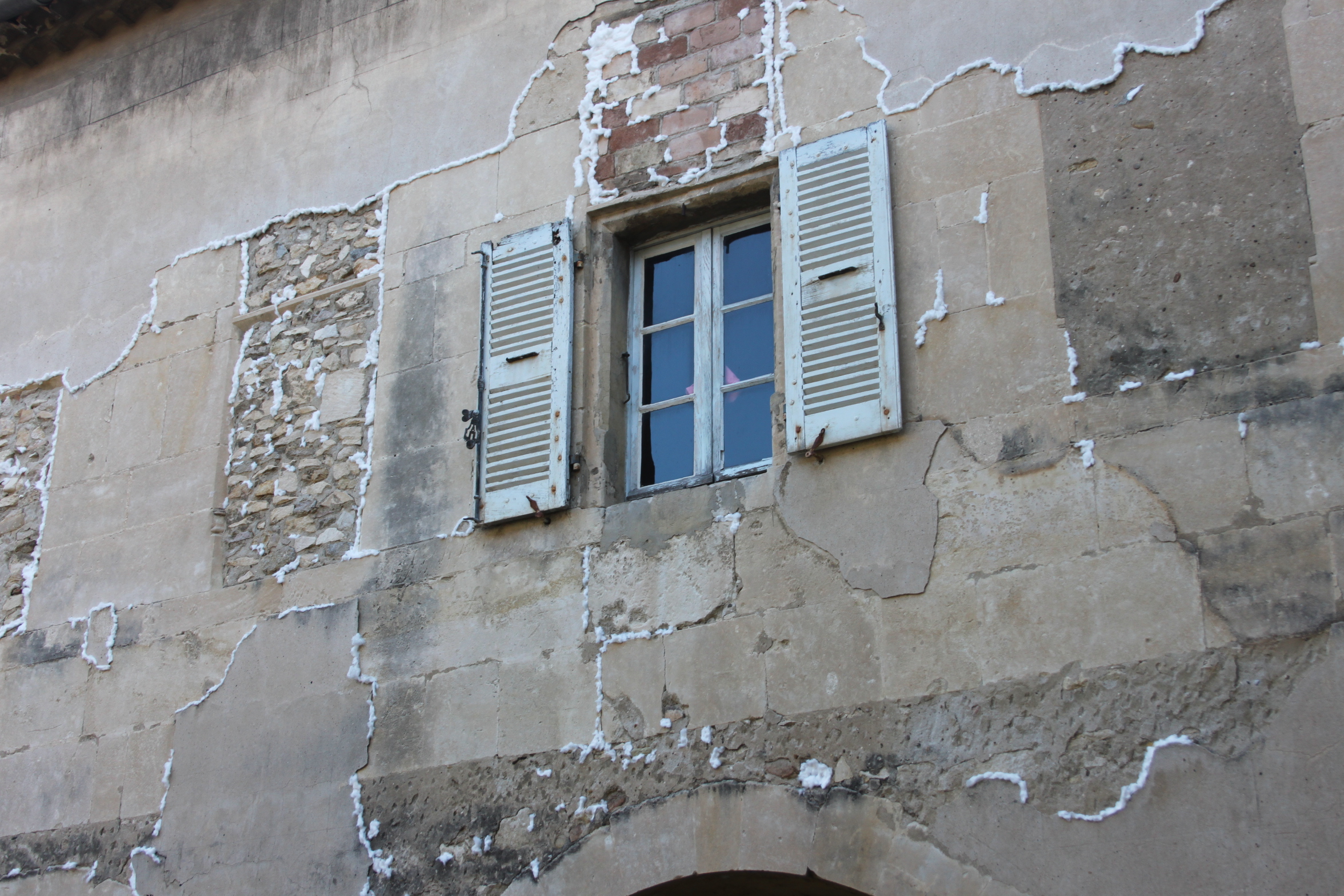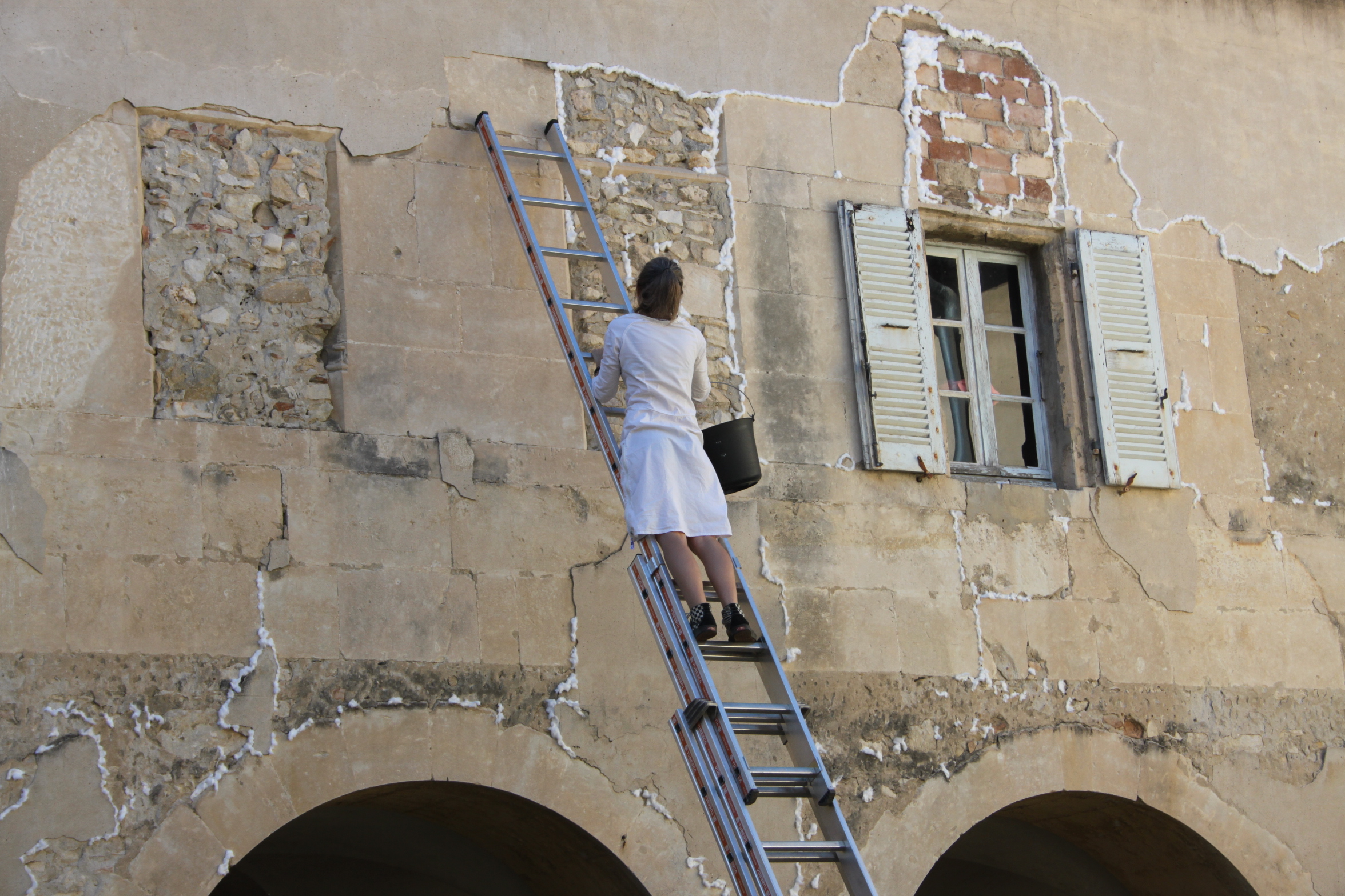 La fièvre est à la fois le moment ou le système immunitaire se défend, mais aussi le moment où l’esprit divague, comme dans un rêve éveillé. Je propose de soigner ces infections bénignes avec de petits nuages de coton, comme si le rêve suintait des façades du cloître: je viendrai disposer du coton blanc dans les fissures des murs. Ce coton restera en place quelques jours, un temps de pause, que la fièvre parte. Cette oeuvre reste éphémère par la matière choisie. Elle prend vie au fur et à mesure de mes interventions, elle est vivante et va s’évanouire»